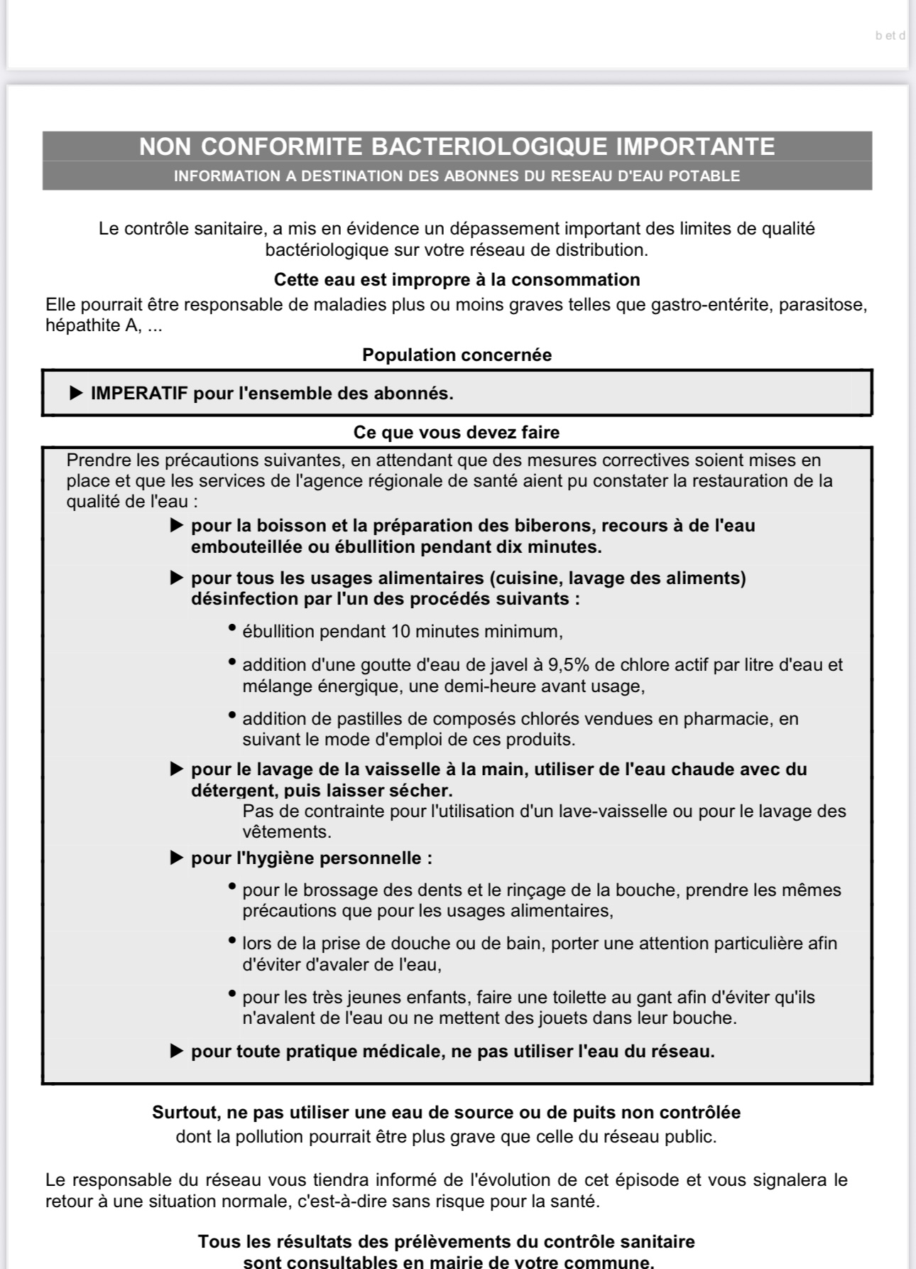 Suite à un contrôle sanitaire de la qualité de l'eau réalisé le 1er septembre nous venons d'être informés d'un dépassement important des limités de qualité. Ces résultats concernent les deux réseaux qui desservent les abonnés de la commune déléguée (excepté les hameaux de Chapchinies, Combechave). Une désinfection "choc" aux réservoirs concernés a été effectué cet après-midi. En attendant voici les principales infos :