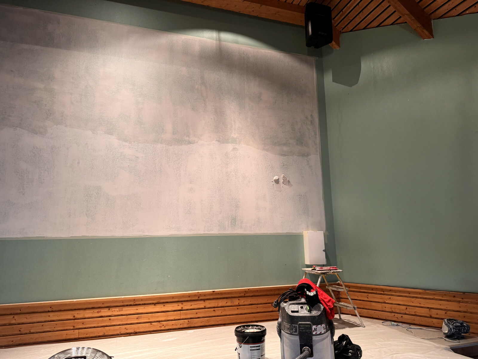 Les travaux ont véritablement débuté hier mardi à la salle des fêtes pour la réalisation d’un écran adapté aux prochaines projections de cinéma. Cet aménagement permettra également aux locataires de la salle, équipés de vidéoprojecteurs, de disposer d’un écran de grande qualité pour la diffusion de vidéos ou de photos (Rappel la salle des fêtes est desservie par un accès gratuit au Wifi). De part et d'autre de l'écran sera mentionnée l'interdiction d'afficher (ne rien fixer sur cette surface, scotch, colle, punaises, agrages, pâte à fix). Les contrevants s'exposeront à l'encaissement du chèque de caution de 500 €.