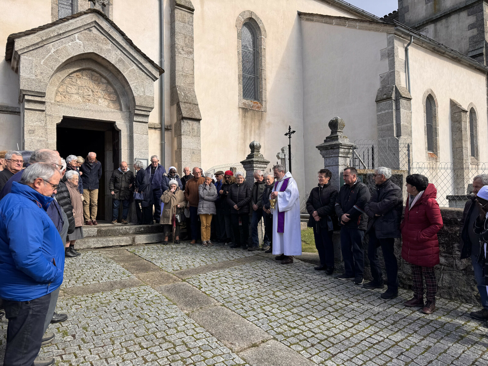 L’église, pleine, s’est rassemblée dans le recueillement. La célébration, simple et belle, a été soutenue par des chants. À l’issue de la cérémonie, les fidèles se sont retrouvés devant l’entrée de l’église pour la bénédiction, avant que le prêtre ne prenne soin d’accompagner chaque famille jusqu’à la tombe de leurs proches disparus dans chacun des trois cimetières.