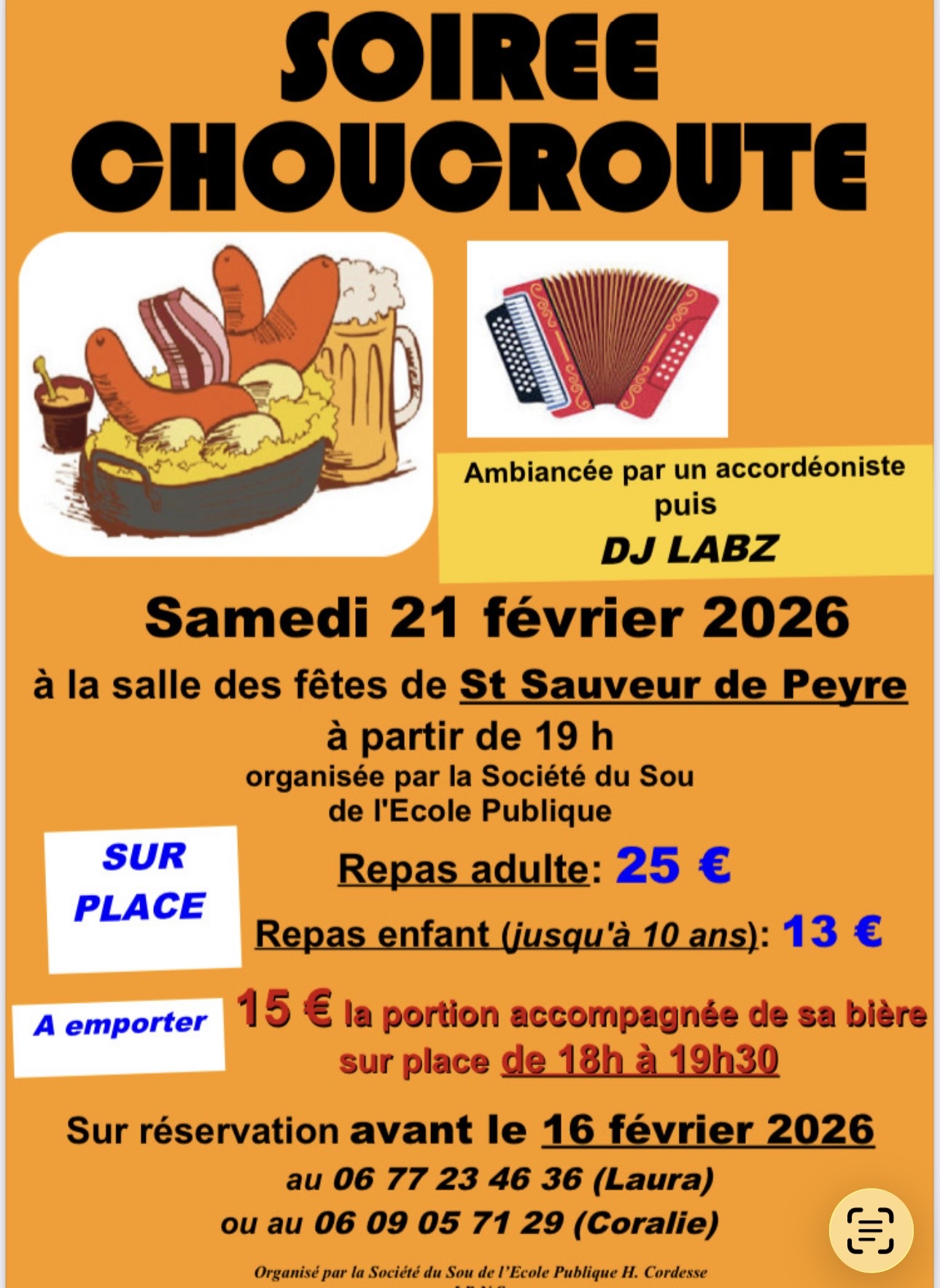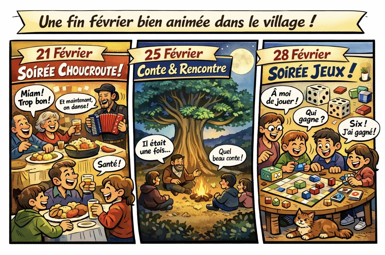La fin du mois de février s’annonce particulièrement animée dans notre commune, avec plusieurs rendez-vous conviviaux à ne pas manquer. Tout d’abord, le samedi 21 février, l’association des parents d’élèves propose une soirée choucroute, un moment festif et chaleureux qui promet de réunir petits et grands autour d’un bon repas.