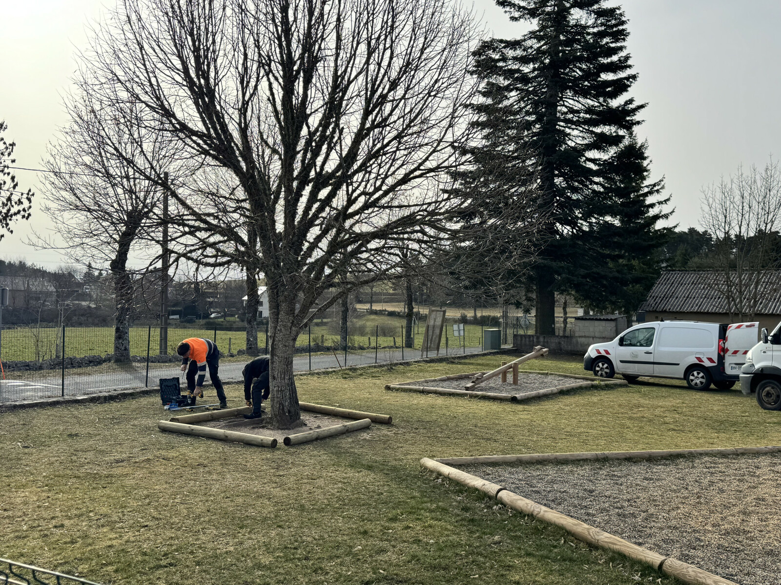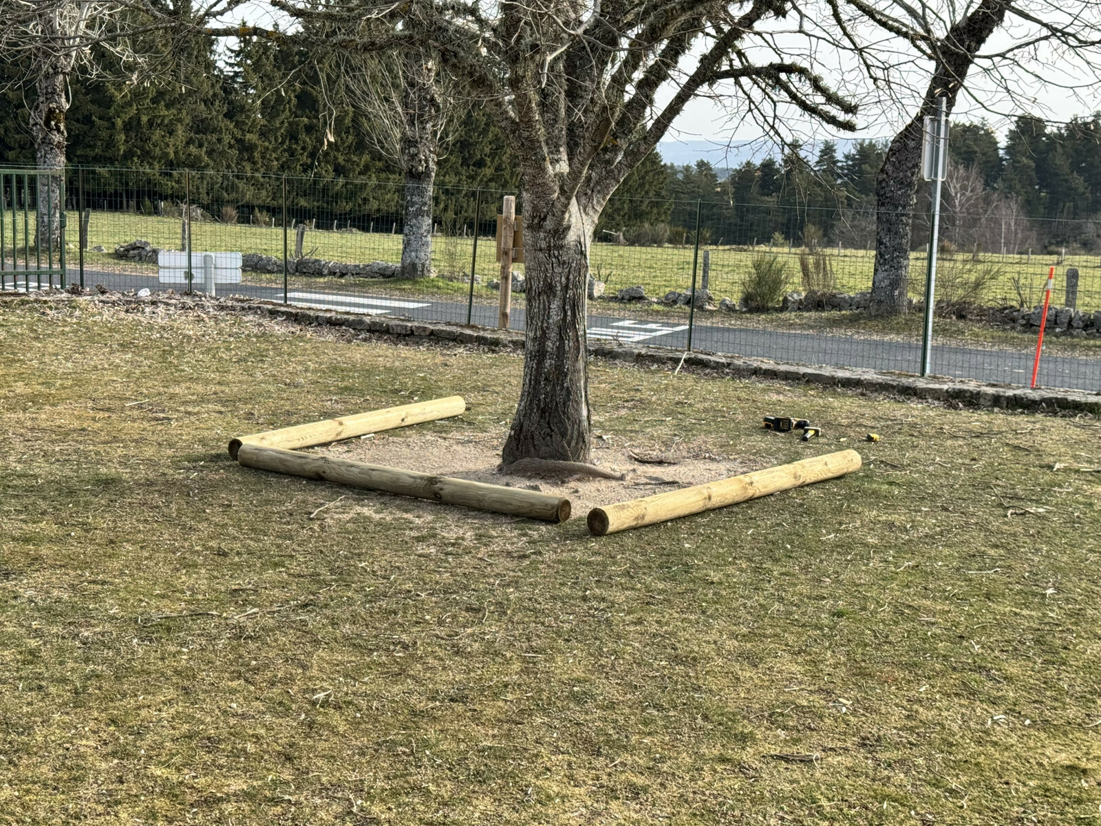 Hier, jeudi, les employés communaux sont intervenus dans la cour de l’école pour réaliser un petit aménagement. À la demande de l’équipe enseignante, des rondins de bois ont été installées autour de l’arbre de la Liberté. Cet aménagement permettra d’éviter que les enfants se prennent les pieds dans les racines et parce qu'ils ont aussi la manie d’y gratter et de creuser. À terme, cette installation pourrait finalement servir de support pour la plantation de fleurs, afin d’embellir encore cet espace symbolique de la cour de l’école. Aller arroser les fleurs pourrait être finalement plus intéressant pour les enfants qu’aller y gratter.