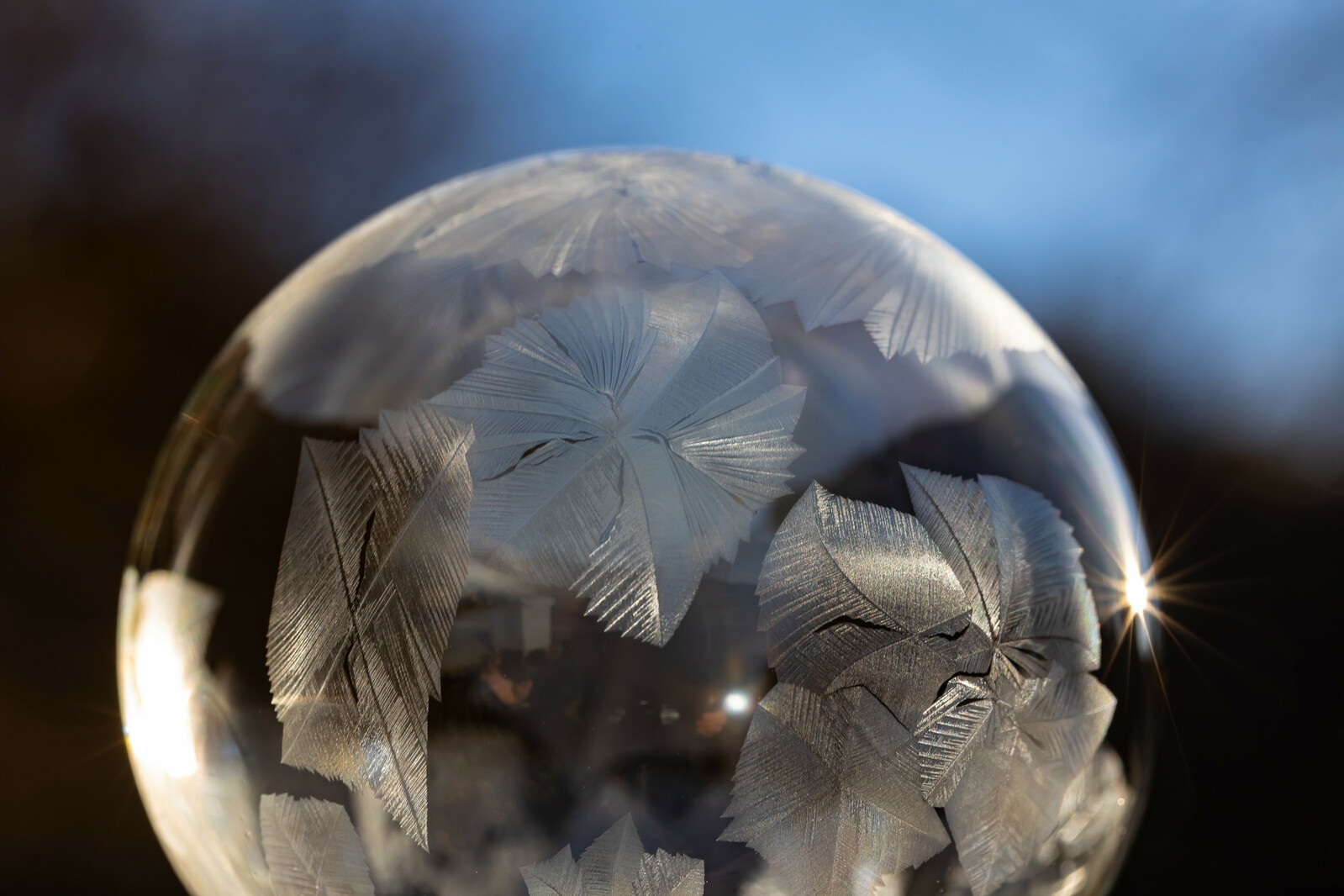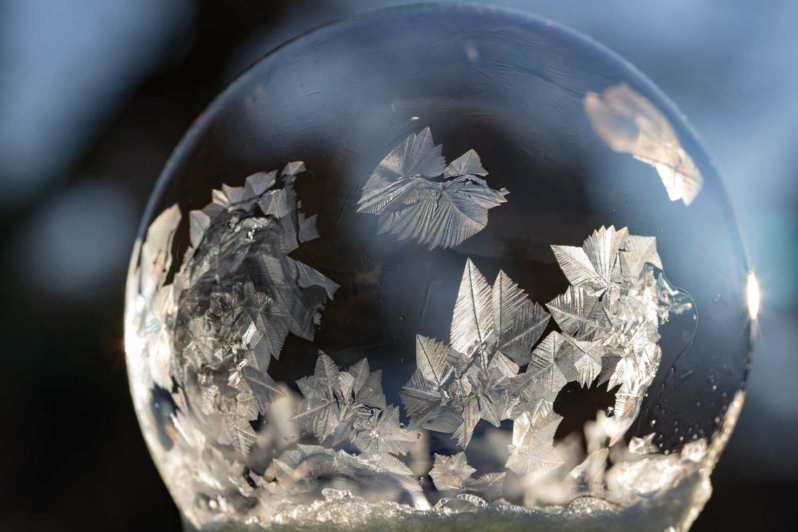 Lorsque la température descend autour de –8 à –10 °C, la magie opère : l’eau contenue dans la bulle commence à cristalliser progressivement. Des motifs de glace se forment alors en étoile ou en plume, qui se développent à la surface comme une fleur de givre. Le photographe doit alors agir rapidement : utiliser un objectif macro ou un zoom rapproché, profiter d’une lumière rasante du lever du soleil, et travailler avec une faible profondeur de champ pour mettre en valeur les cristaux. Chaque bulle devient ainsi unique et éphémère, car elle finit généralement par geler entièrement… puis éclater quelques instants plus tard. C’est ce qui donne à ces images leur caractère spectaculaire et fragile. ❄️