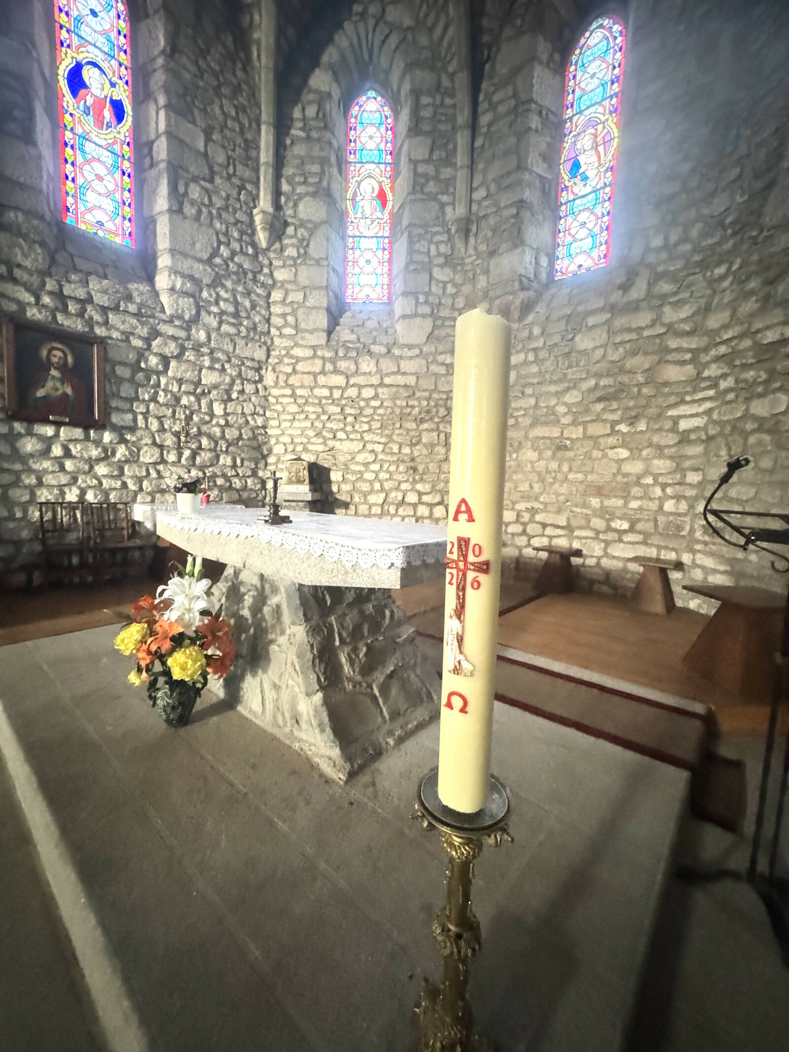 Pierre -Yves Girod est venu hier (samedi) installé le nouveau cierge pascal. Il nous a précisé la signification de sa présence à droite de l’autel : "le cierge pascal porte plusieurs symboles forts : la croix, les lettres Alpha et Oméga (le commencement et la fin), ainsi que les chiffres de l’année. Cinq grains d’encens y sont souvent fixés, rappelant les plaies du Christ. Présent tout au long du temps pascal* il accompagne également les grands moments de la vie chrétienne, comme les baptêmes et les funérailles, signe d’espérance et de vie nouvelle" et de nous préciser "dans nos églises, cette flamme discrète mais constante rappelle, au-delà des mots, que la lumière l’emporte toujours sur l’obscurité." Nous remercions Père-Yves Girod pour ses explications. Il devait poursuivre dans les autres églises de Peyre en Aubrac cette installation du Cierge Pascal.